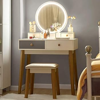 Bewishome vanity table and stool set is a stylish and functional contemporary piece of furniture to your home. Croix collection vasagle is a modern and stylish vanity set that features a round mirror and black sophisticated shade. Three shelves can hold your spray bottles, lotions, home dã©cor and favorite photos you like. Lockable jewelry cabinet with mirror, desktop makeup organizer, 2 sliding drawers offer ample storage space for your jewelries, makeup, nail polish, hair accessories and other beauty supplies. Frenchi home furnishing 3 piece wood vanity this crown mark product is a versatile set of table and stool.